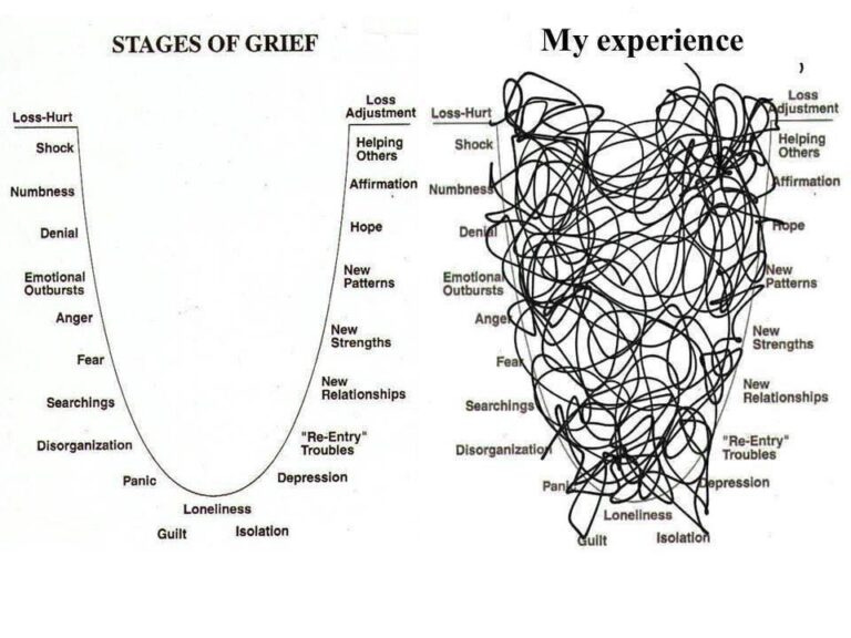 This article has been all over the place, nothing like linear, something like the ‘my experience of grief’ image. You may be feeling some mental or emotional whiplash from it all.